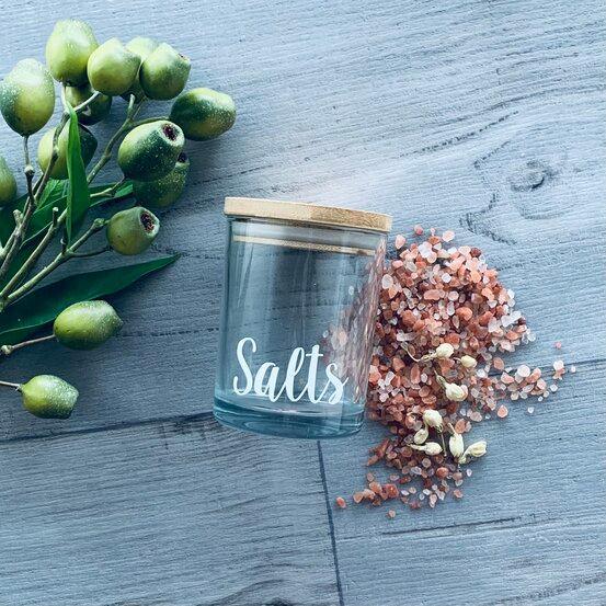 A generous 310ml thick clear glass jar with a White vinyl Salts label is the perfect way to present gifts of DIY bath salts. Comes with a Bamboo lid.