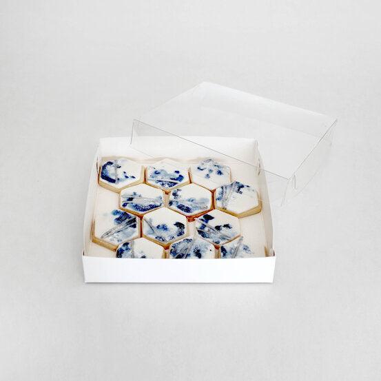 This Beautiful box is the perfect way to present your product, with it's crystal clear lid for easy viewing. It's also strong enough to transport your products, made from high quality 400GSM milk board. It would be the perfect extra large biscuit box for wedding cookies or for showing off your baked goods at market stalls.