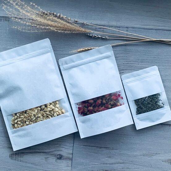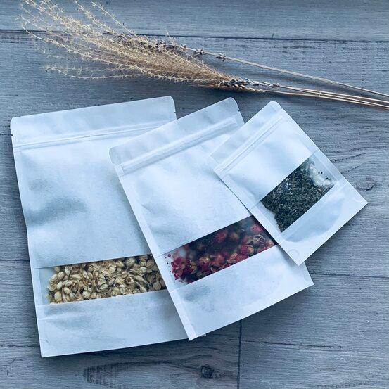 This Large white window pouch is ideal for stylishly displaying food items such as coffee beans, dried tea leaves, muesli, nuts and dried fruits. The stock range is available in Brown and Three sizes, this stand-up pouch is perfect for retail and markets, Heat sealable, Tamperproof and re-sealing.
