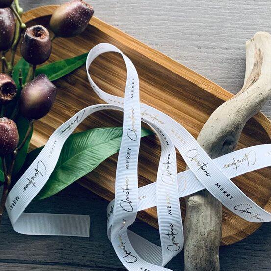 Merry Christmas Grosgrain Ribbon - Gold on White. Fresh & classy – Centaur Packaging