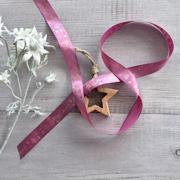 Add a warm festive touch to your gifts with this pink-plum satin ribbon. It has a smooth sheen that catches the light beautifully, with Merry Christmas printed along the length and small trees, presents, snowflakes, and little festive icons scattered through the design.