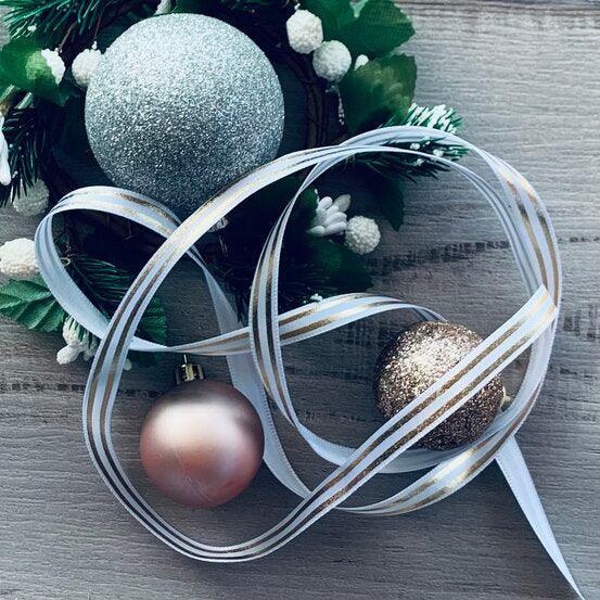 White satin ribbon featuring a shiny finish with metallic gold foil stripes running down its length. This ribbon provides a classy finish to gifts for any occasion including weddings, birthdays or Christmas.