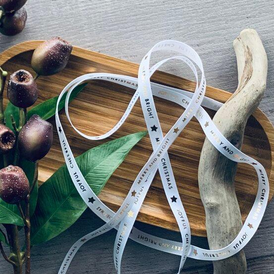 This Delightful & Fun Christmas Cheer Grosgrain Ribbon is perfect for gift wrapping, tying bows or using for any Christmas crafts. With ‘Joyful Cheerful Merry Christmas” script in metallic gold on white ribbon it certainly will make a statement.